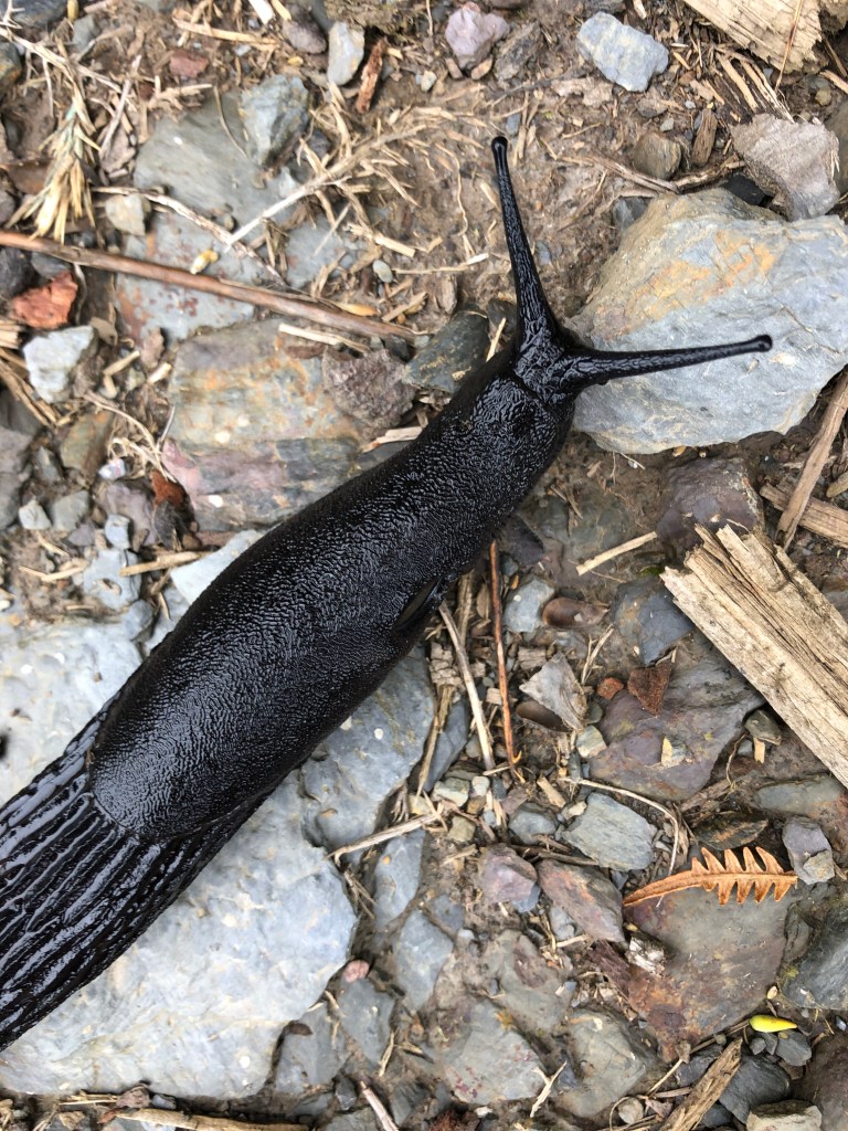 We had a couple stints getting off mountainous trails and walking on the road. These giant colorful slugs, nearly the size of my boot, inched along with us.