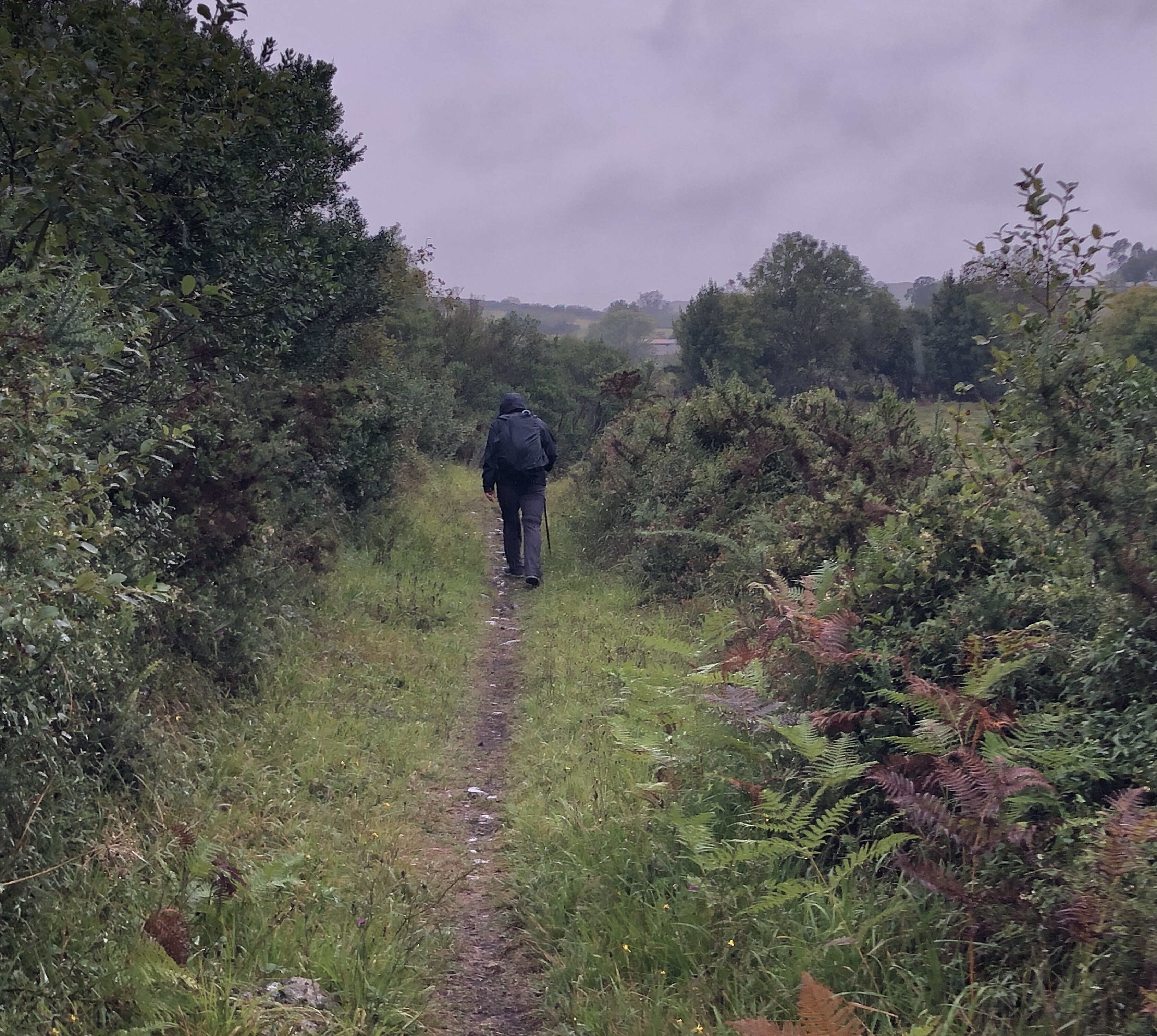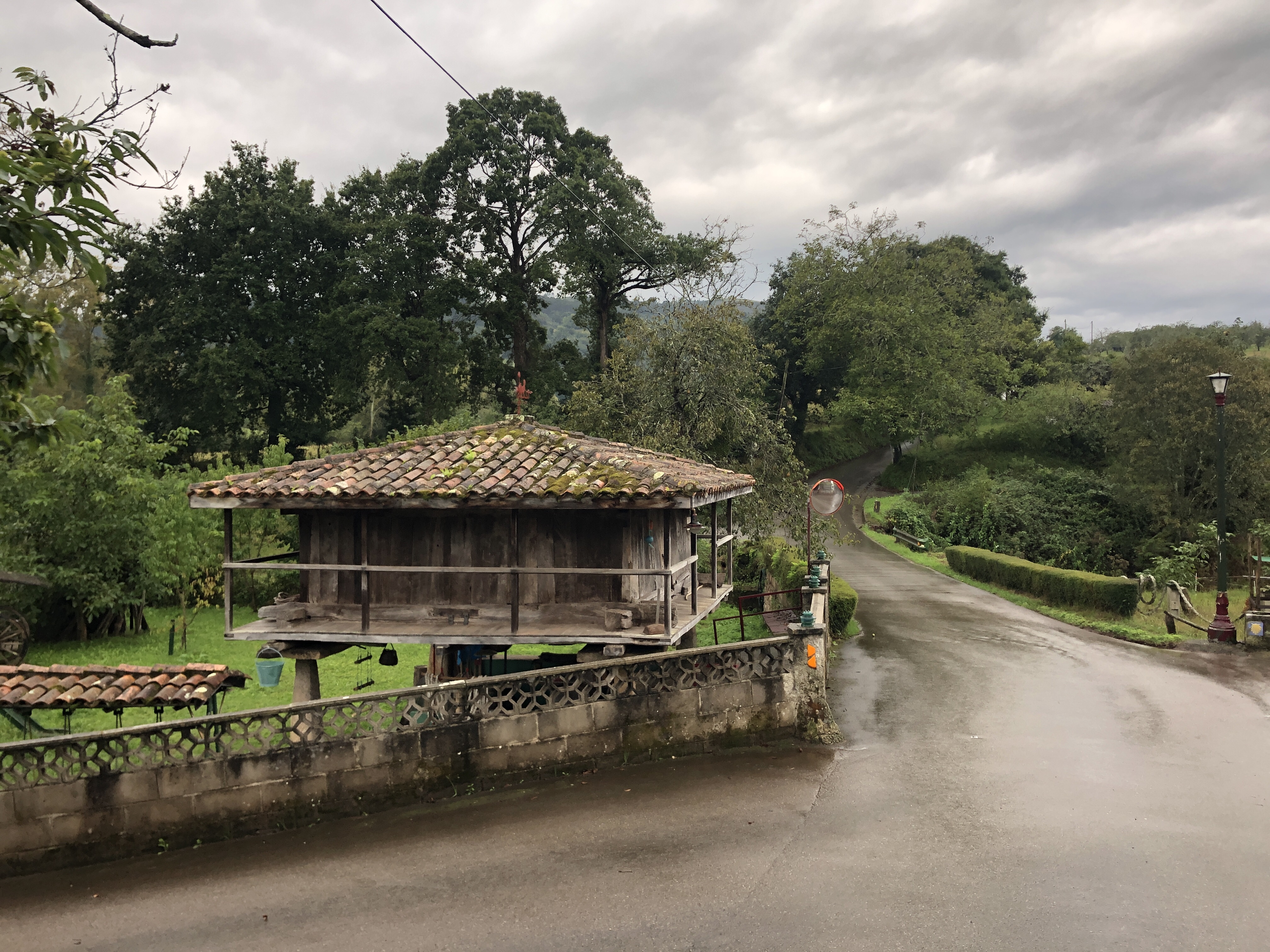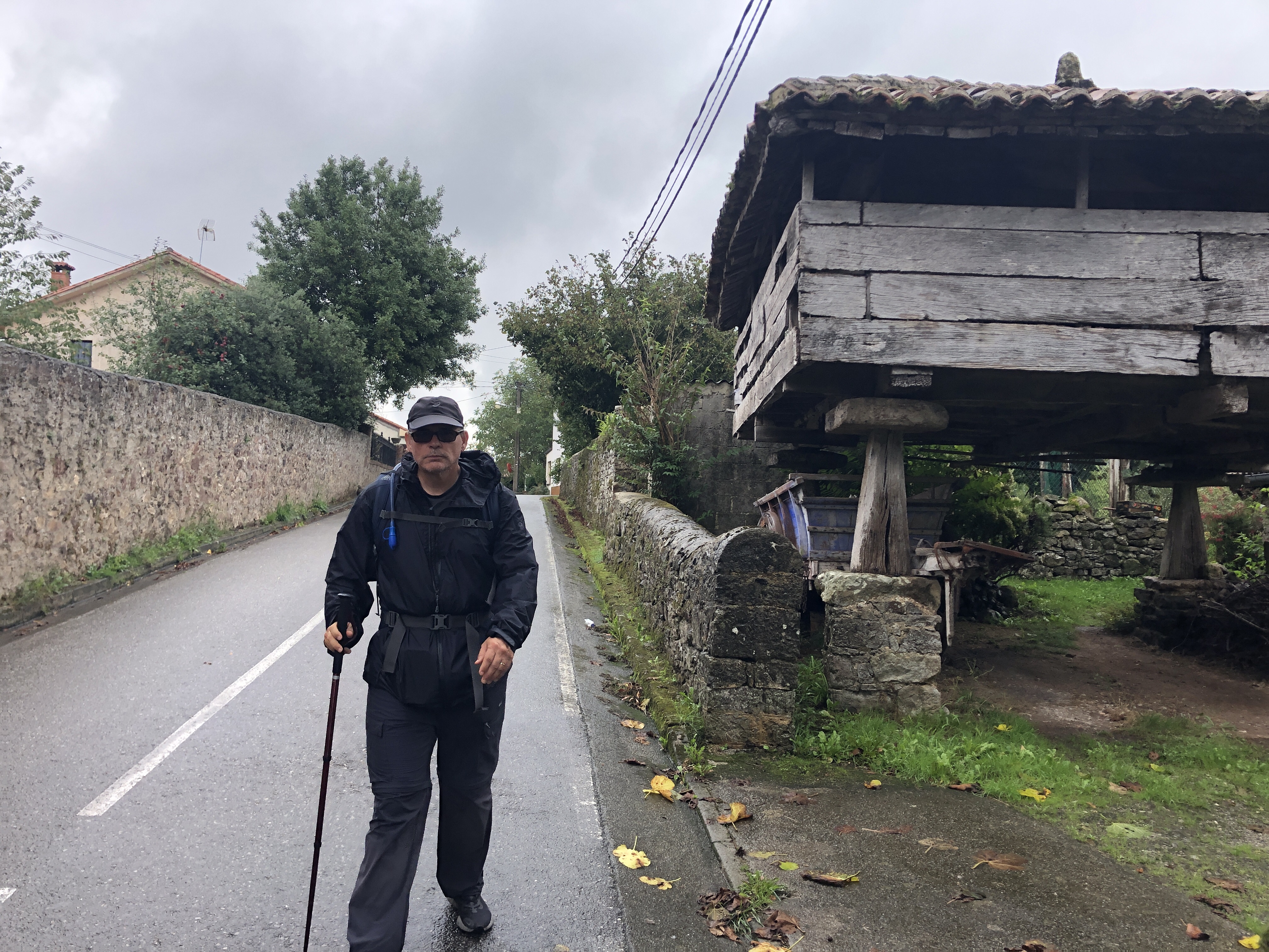 The main irritant besides the rain was dogs growling and snarling at us nearly the whole Camino trek today. There were angry chained German Shepherds and Perro de Presa Canario, a Mastiff dog breed from the Canary Islands off the coast of Spain, known to be aggressive guard dogs. We weren’t sure if these dogs were protecting cider vats and presses or just a warning by the hardy people inside that they weren’t to be trifled with. But every house had 3-4 dogs as well as alarm signs. Historically, Asturians were the only people not conquered by the Moors during their occupation in Spain, and earlier when the Romans liberated Spain from the Carthaginians and tried to be one power to keep safe boundaries in Spain, Asturians, an aggressive, recalcitrant people from Celtic origins, declined and offered a lengthy resistance to Romans. They proved they were capable of defending themselves. (Asturians, have a DNA match to Celtic tribes with Danish and Norse Viking blood. And interestingly enough in Asturias, there are megalithic burial mounds/dolmens that mirror Celtic burial mounds in Ireland.) Asturuans are as rugged as their mountains. There terrain is considered one if the most difficult to traverse with its steep hills, narrow valleys and wet conditions. We are both of Celtic descent, with Steve also carrying Basque DNA, and we did just fine stubbornly walking on in our sodden boots as other drenched poncho covered pilgrims lagged behind.